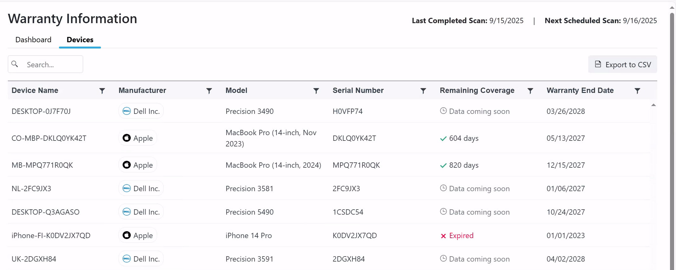 The Warranty Information page's Devices tab shows additional device warranty details. You can sort or filter each column and search all device warranty information. There is also an option to Export to CSV which can export unfiltered and filtered data.