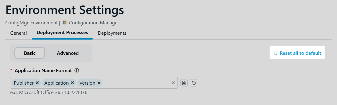 After the default deployment process configuration is set up, you might choose to set different options for other deployment processes. It's possible to return all deployment processes to default settings but doing so means that any custom settings will be lost.
