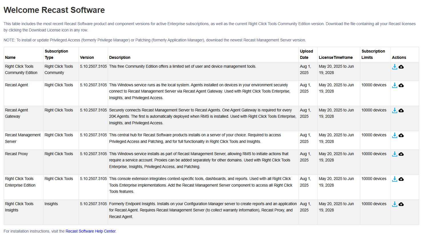 1. Download or copy your Recast Software product and component licenses from the Recast Portal by clicking on the cloud icon under Actions.