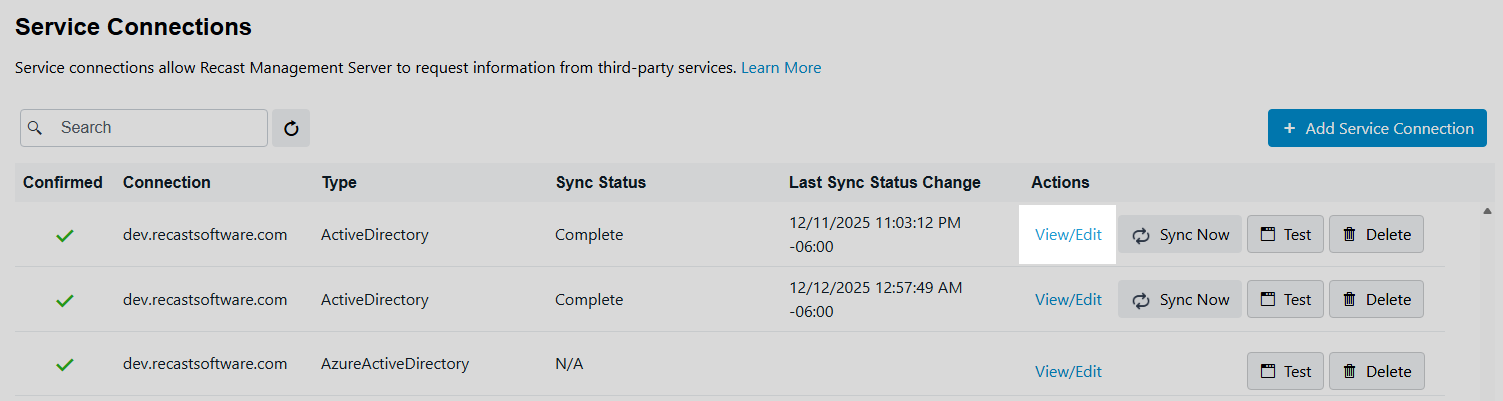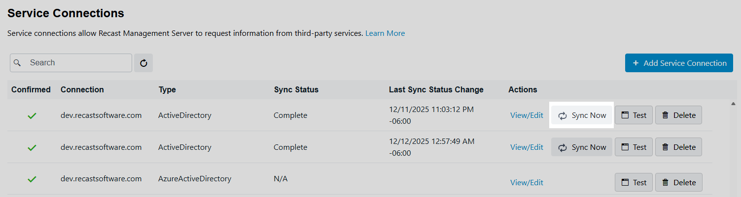 - Sync Now to immediately update service connection data from Configuration Manager or Active Directory. See Synchronize Service Connection Data.