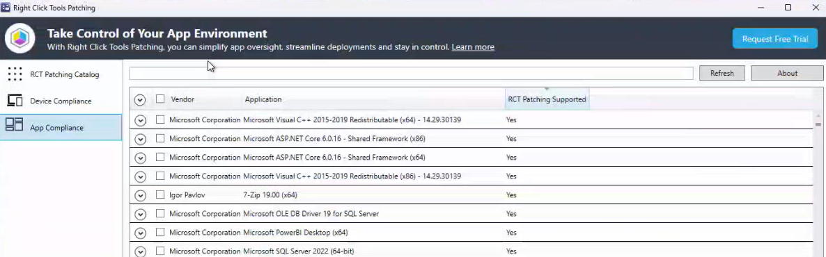 Right Click Tools Enterprise customers and Community users can easily identify the applications in their environment that are available to update using Right Click Tools Patching. The App Compliance tab in your ConfigMgr console displays the applications in the RCT Patching catalog that are detected in your Add/Remove Programs inventory.