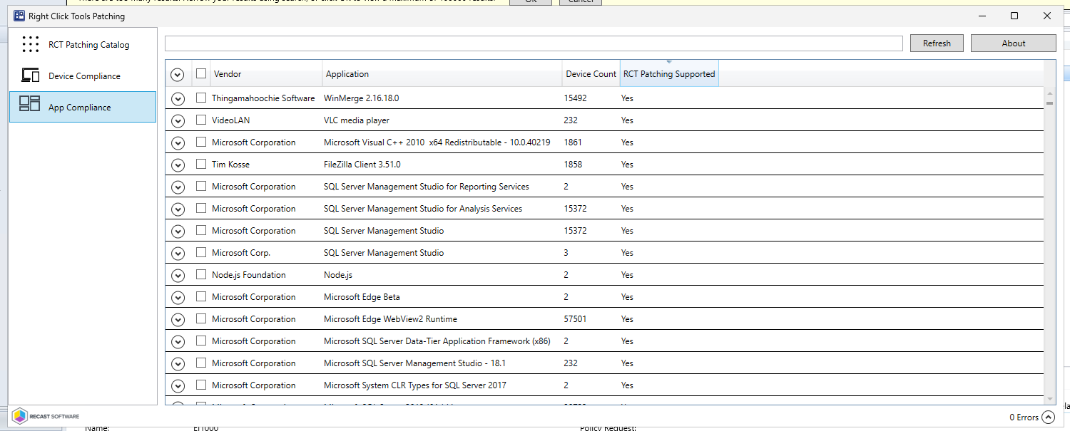 "The App/Device Compliance tools compare your ConfigMgr hardware inventory data to Recast's Right Click Tools Patching catalog. In our initial release, the resulting report shows which applications could be patched with Right Click Tools Patching. Future versions will display the vendor's current version, counts of devices, and CVE information. Inventory data is anonymized."